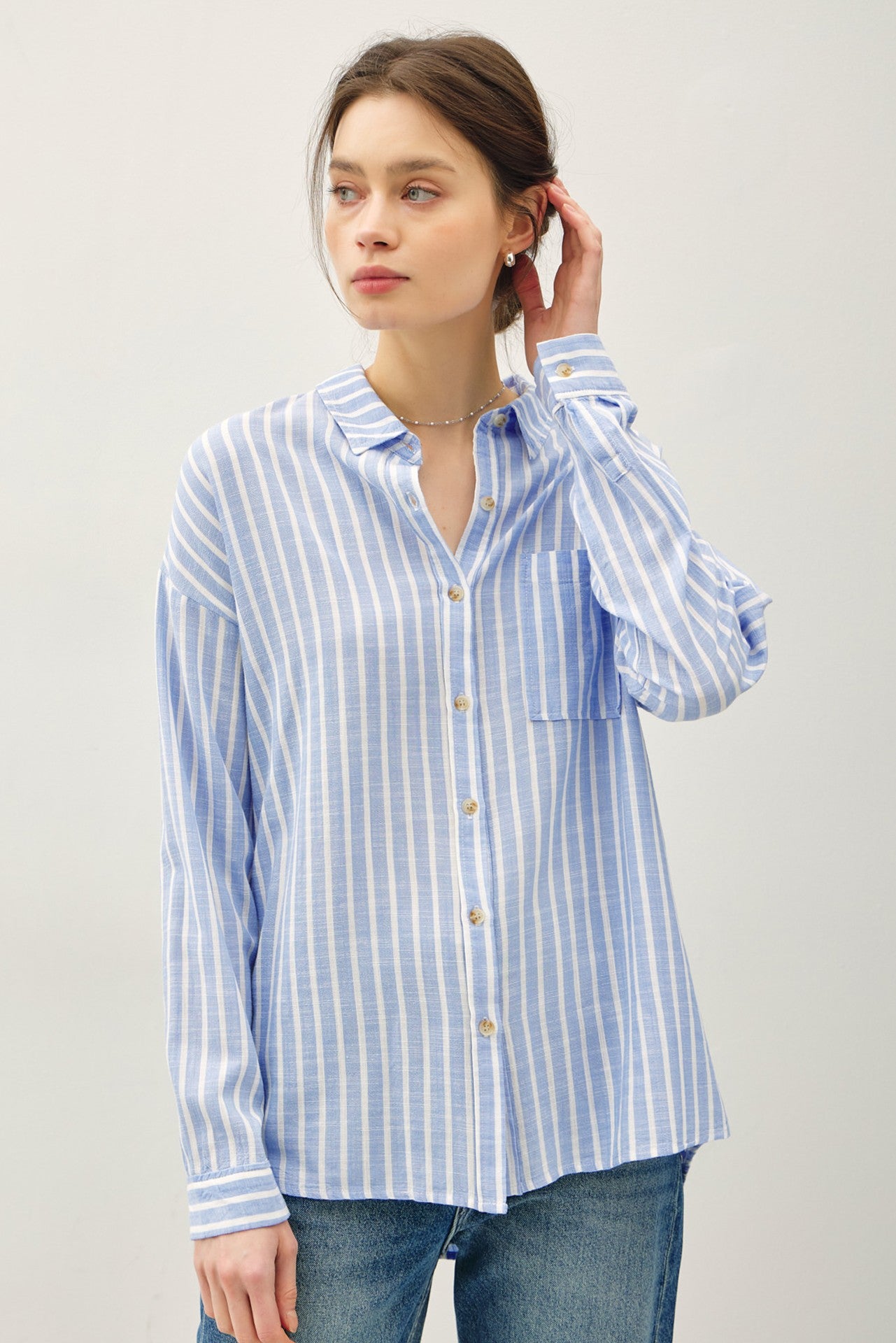 Stripes never go out of style—and this Bengal striped button-down proves it. Featuring a relaxed comfort fit with a dropped shoulder cut, it's the kind of shirt that works whether you're dressing up or keeping it casual. The lightweight fabric makes it perfect for layering or wearing solo, while practical touches like the chest pocket and back yoke add just enough structure to keep things interesting. Classic, versatile, and effortlessly cool.